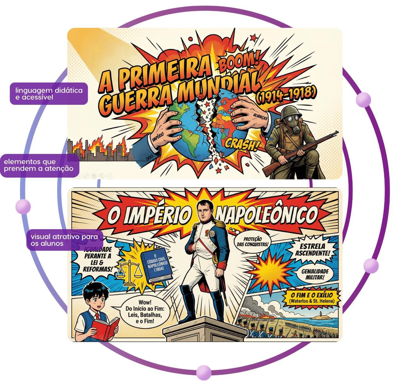 O formato em quadrinhos torna a apresentação mais envolvente, melhora a atenção da turma e facilita a aprendizagem, especialmente em conteúdos que costumam parecer abstratos ou distantes da realidade dos alunos.
