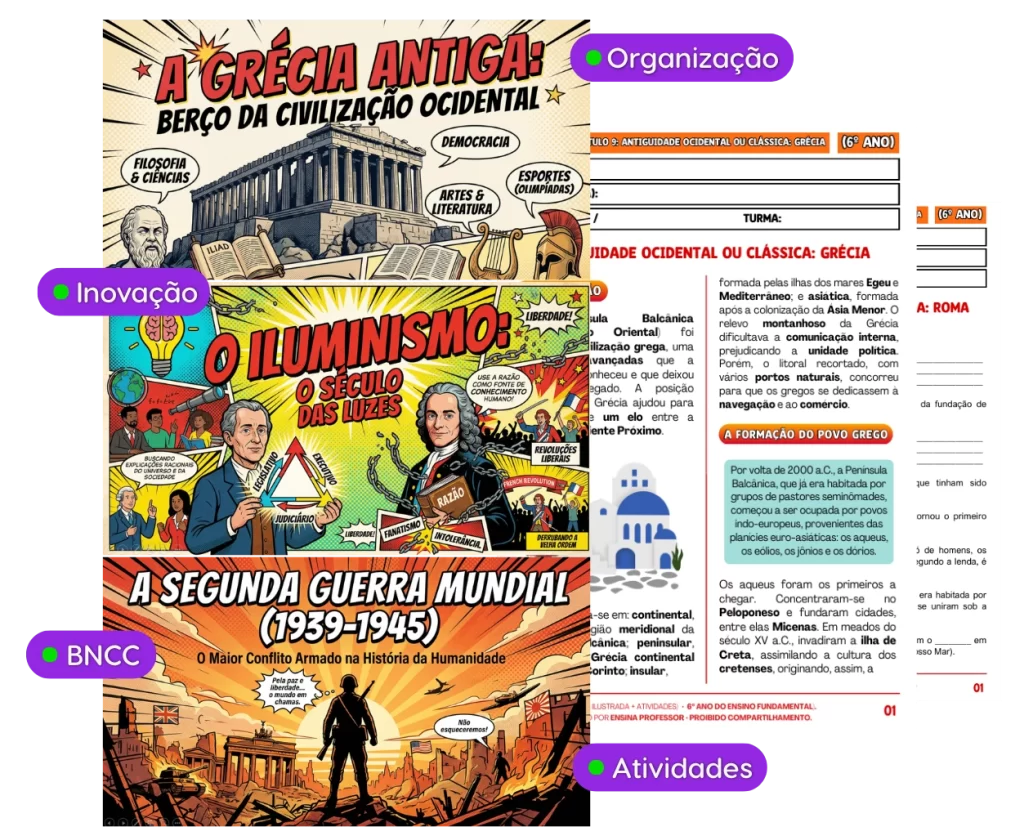 Aulas estruturadas em formato de quadrinhos, apostilas teóricas ilustradas e centenas de atividades inéditas que economizam horas de preparação e elevam a qualidade das suas aulas.